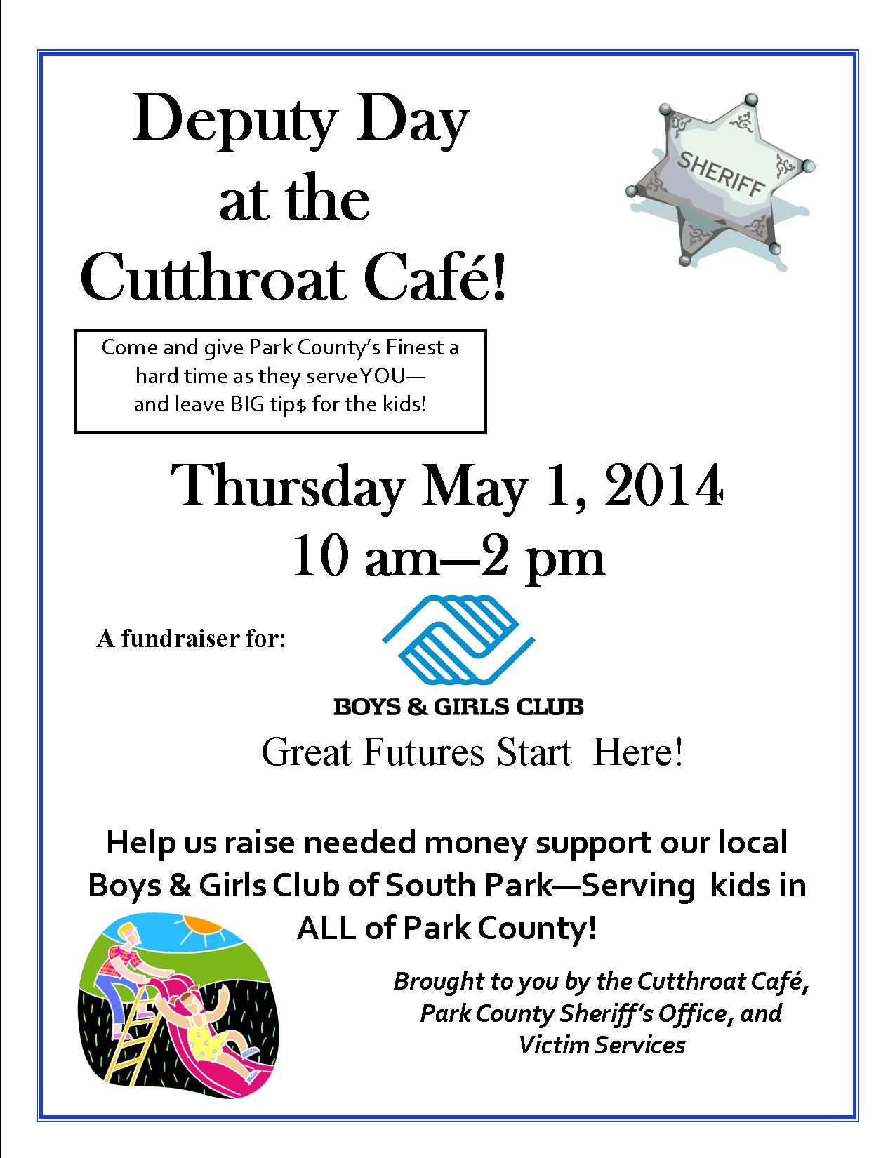 The Park County Sheriff's Office and Victim Services is once again sponsoring a fundraiser for the Boys & Girls Club Thursday May 1, 2014.